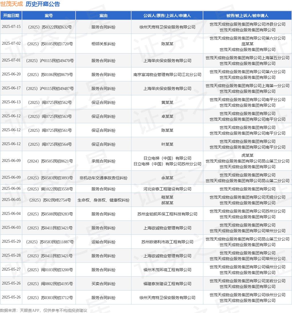 本站消息,根据天眼查APP显示,近日公布了一则世茂天成物业服务集团有限公司作为被告/被上诉人的开庭公告,详细内容如下: